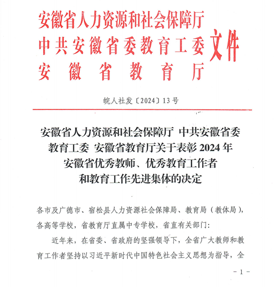 近日,安徽省人力资源和社会保障厅、中共安徽省委教育工委、安徽省教育厅联合下发了《关于表彰 2024 年安徽省优秀教师、优秀教育工作者和教育工作先进集体的决定》,我校人文与艺术学院刘众一老师被表彰为2024年“安徽省优秀教师”。