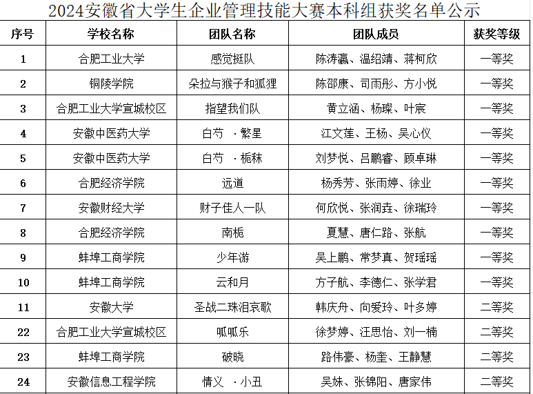 10月20日,由安徽省教育厅主办,安徽财经大学承办的2024年安徽省企业管理技能大赛决赛圆满落幕。此次决赛有来自合肥工业大学等34所省内高校的100余支参赛队伍参加,我校获评“优秀组织奖”,参赛团队取得一等奖两项,二等奖一项的优异成绩。