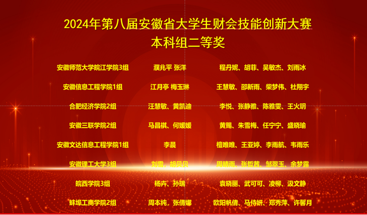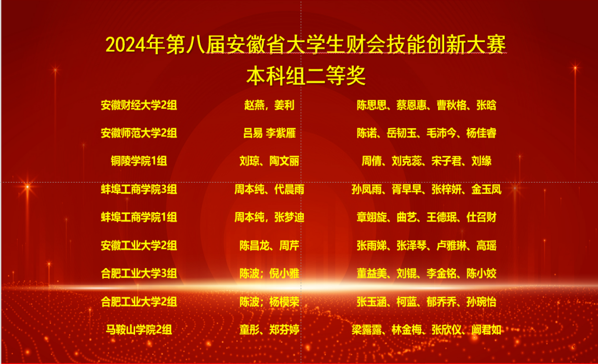 此次比赛吸引了合肥工业大学、安徽师范大学、安徽财经大学、安徽工业大学等29余所省内本科院校87支队伍参赛。在指导老师周本纯、张梦迪、张倩娜、代晨雨的精心指导下和参赛队员的共同努力下,我校财务与审计学院派出的三支队伍充分发挥了团队协作的优势,队员们配合默契,每个人发挥出自己的优势,在比赛中凭借扎实的专业知识和优秀的团队协作能力,在众多参赛队伍中脱颖而出,取得了好成绩。
