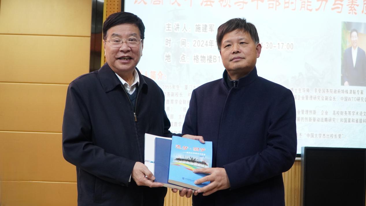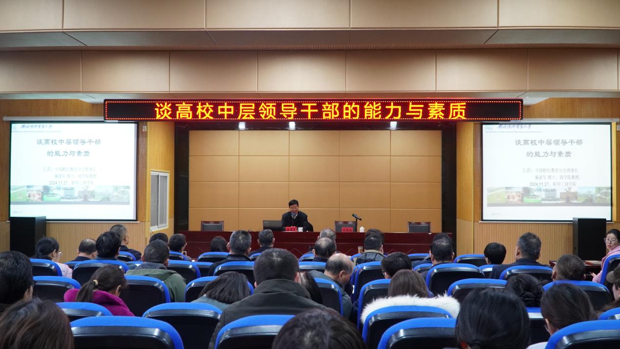 11月27日,中国高等教育学会财经教育分会理事长、博士生导师施建军教授应邀来访我校,在格物楼B101报告厅作了题为“谈高校中层领导干部的能力与素质”的讲座。我校全体校领导、中层干部和京师实验高级中学相关领导参加,讲座由校长刘福成教授主持。