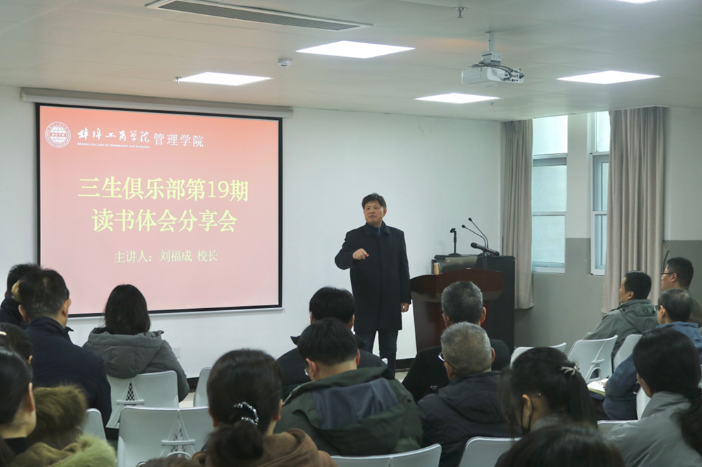 12月11日下午,管理学院三生俱乐部第19期分享会在图书馆五楼508会议室隆重举行。本期活动特邀校长刘福成教授作主题为“读书体会”的精彩分享。行政机关、教学院部近百位教师参加了分享会,分享会由管理学院院长刘冬华主持。