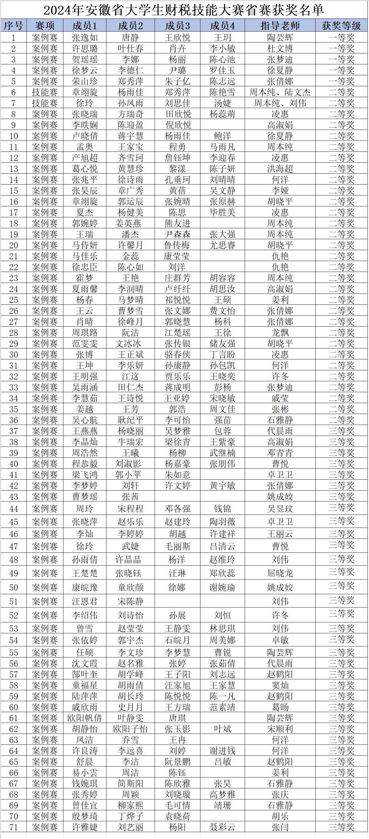近日,由安徽省教育厅主办、安徽财经大学承办的2024年安徽省大学生财税技能大赛成绩公布。全省30余所本科院校1140多支队伍参与比赛,我校财务与审计学院共推荐105支队伍参与案例赛和技能赛,有71支队伍获奖,其中一等奖5项,二等奖31项,三等奖35项,取得我校参与该比赛以来最好成绩。