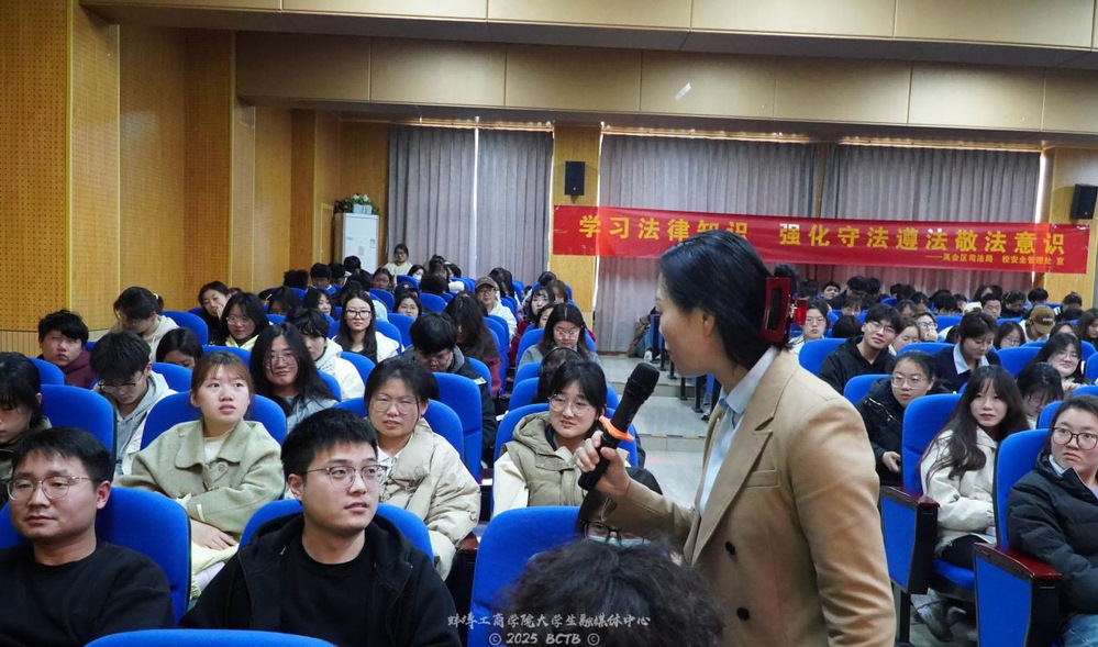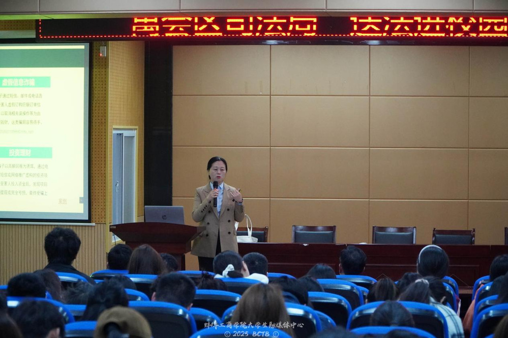 讲座环节,沈田律师以“明法文、重防范,守护美好生活”为主题,结合大学生群体高发的兼职刷单、虚假二手交易、游戏账号买卖等典型案例,深入剖析电信诈骗的常见手段与防范技巧。通过情景模拟和互动问答,沈律师提醒师生“不轻信、不转账、不泄露,切实守好‘钱袋子’”;“明法条、不投机、有底线,不做电诈‘工具人’”。