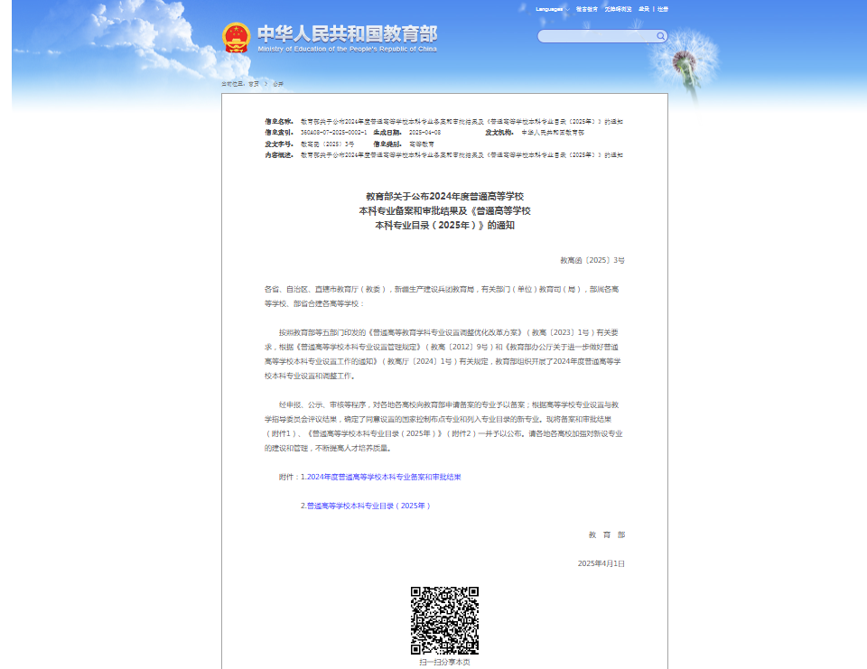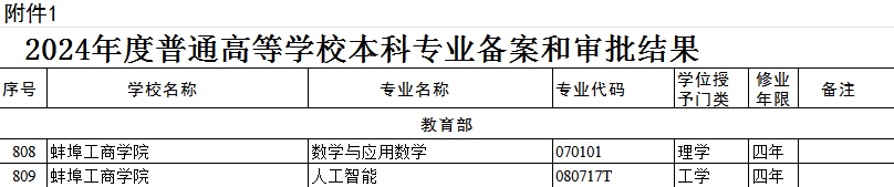 近日,教育部发布《关于公布2024年度普通高等学校本科专业备案和审批结果的通知》(教高函〔2025〕3号),蚌埠工商学院申报的数学与应用数学(专业代码070101)及人工智能(专业代码080717T)两个本科专业获批设置。