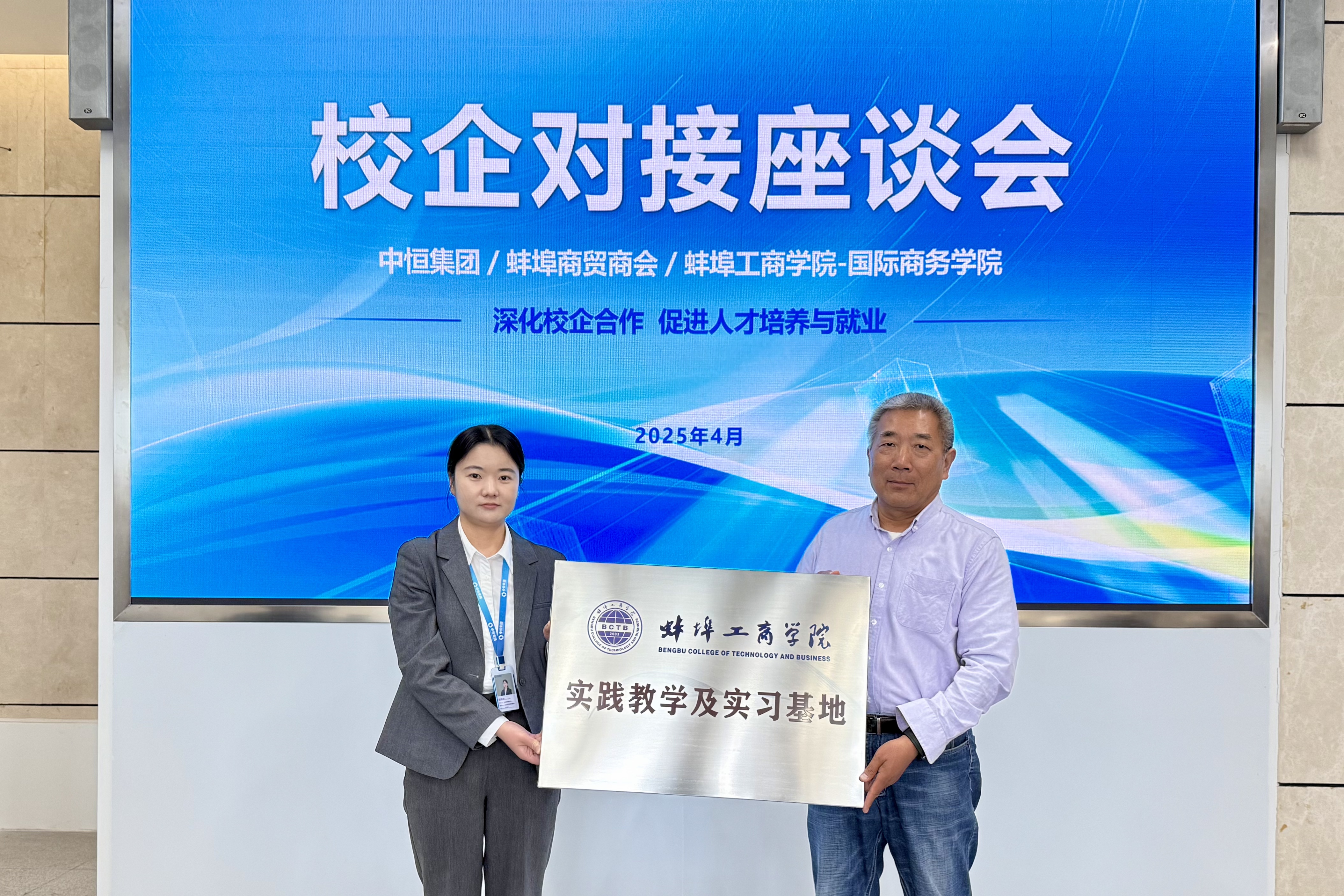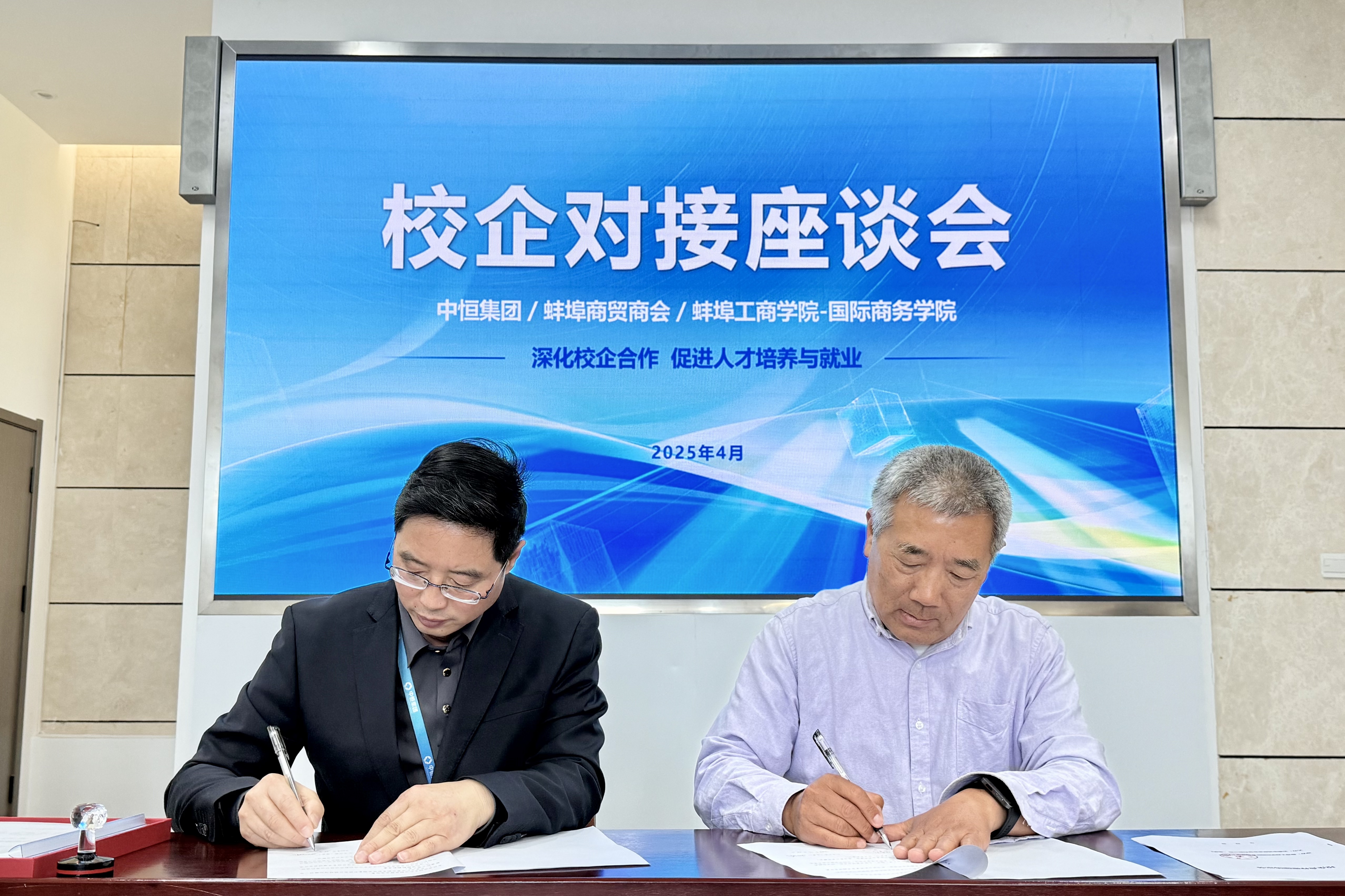 4月25日,在蚌埠市工商联的推动下,国际商务学院联合蚌埠市工商联、中恒集团、蚌埠市商贸商会及十余家会员企业举行校企合作座谈会暨签约仪式,深化产教融合,助力毕业生高质量就业。市政协副主席、市工商联主席储昭节、市工商联经济咨询部部长王婷婷,国际商务学院院长徐松、党总支副书记周辰姣、团委书记程露,中恒集团副总裁刘冰、人力行政总监赵玲玲等出席活动。