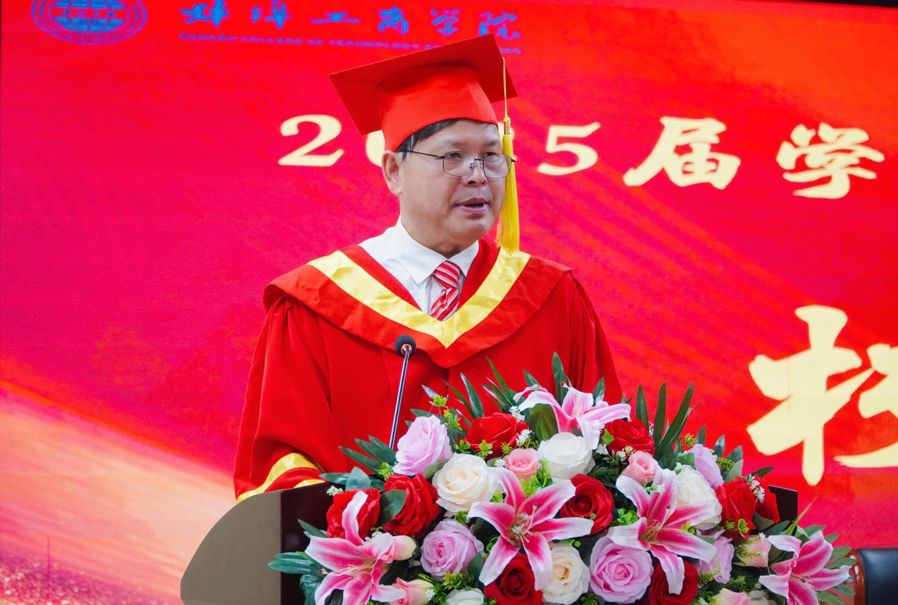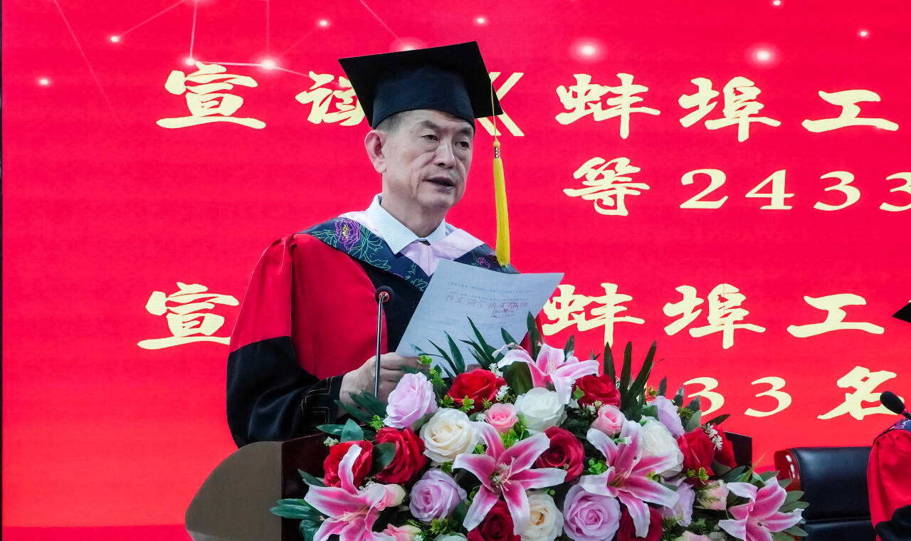 刘福成代表蚌埠工商学院党政领导和全体师生员工向圆满完成学业、即将奔赴新征程的2449名毕业生表示最热烈的祝贺。他指出,青年学子生逢盛世,成长成才在中国特色社会主义新时代,既是国家发展的见证者,更是民族复兴的参与者,未来施展才华的舞台无比广阔,实现梦想的前景无比光明。在开启人生新篇之际,刘校长向全体毕业生提出三点殷切期望:第一,要以家国情怀滋养生命,做民族复兴的筑梦者,在民族复兴伟大征程中脚踏实地,在科技创新的浪潮中勇立潮头,以“追风赶月莫停留”的奋进姿态书写时代华章;第二,要以数智赋能锻造核心竞争力,做科技强国的领跑者,以“弄潮儿向涛而立”的魄力,主动拥抱数字化浪潮,将终身学习作为立身之本,持续提升数字思维与智能技术的应用能力,让数智赋能成为个人成长的倍增器,同时立足国家战略需求,将数字创新能力转化为服务科技强国的真本领,在智能时代的赛道上跑出中国青年的加速度,真正成为堪当科技强国先锋队;第三,要以崇德向善铸就人生底色,做向阳而生的追光者,如青松般正直坚韧,似苔花怀牡丹之志,以德立身、以善化人,在平凡中播种善良,在逆境中培育勇气,以“君子怀德”的胸襟拥抱世界,以“立根原在破岩中”的信念扎根时代,永葆“天生我材必有用”的灼灼信念,持明德为灯,秉善念为桨,在复兴征程的星辰大海中做奔涌的浪花,更做照亮远方的灯塔。