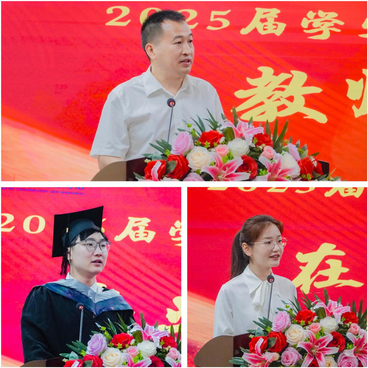 计算机与数据工程学院计算机系主任刘华锐副教授代表全体教师、2025届金融2班谢艺泓代表2025届毕业生、2022级英语2班张思源代表在校生分别作了发言。