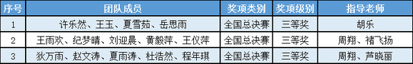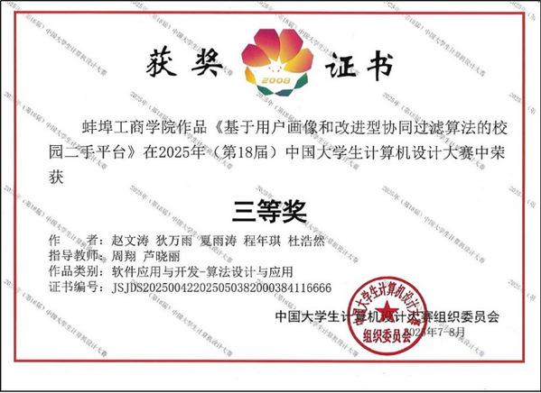 由狄万雨、赵文涛、夏雨涛、杜浩然、程年琪组成的团队,在周翔、芦晓丽老师指导下,以作品《基于用户画像和改进型协同过滤算法的校园二手平台》参加“软件应用与开发/算法设计与应用”赛道。该平台提升交易匹配效率,解决校园痛点,荣获全国三等奖,评委称赞其技术落地性强。