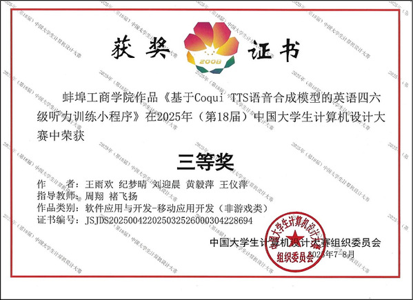 由王雨欢、纪梦晴、刘迎晨、黄毅萍、王仪萍组成的团队,在周翔、褚飞扬老师指导下,开发《基于Coqui TTS语音合成模型的英语四六级听力训练小程序》,参加“软件应用与开发类”决赛。团队攻克技术难题,优化用户体验,荣获全国三等奖,体现出优秀的软件开发能力。
