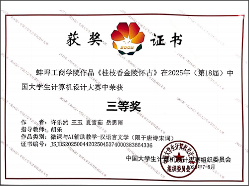 由许乐然、王玉、夏雪茹、岳思雨组成的团队,在胡乐老师指导下,以作品《桂枝香金陵怀古》参加“微课与AI辅助教学/数媒静态设计”赛道。作品结合历史文化与数字技术,在激烈竞争中荣获全国三等奖,彰显了优秀的专业素养和创新精神。