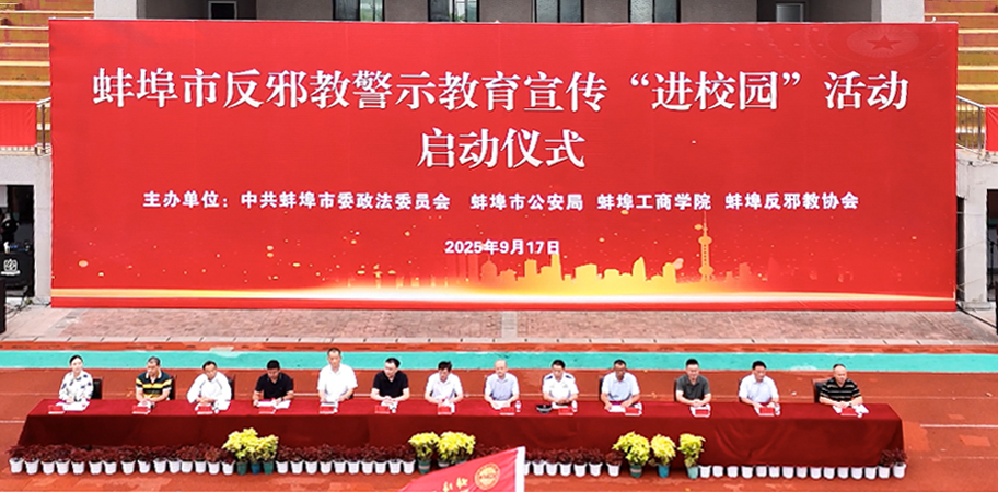 9月17日下午,蚌埠市反邪教警示教育宣传“进校园”活动启动仪式在我校举行。此次活动由中共蚌埠市委政法委、蚌埠市公安局、蚌埠工商学院、蚌埠市反邪教协会主办。督导专员、党委书记杨烨,蚌埠市委政法委副书记徐崇武,蚌埠市禹会区委政法委书记王健,蚌埠市公安局政保支队副支队长陈疆,以及市委政法委、驻蚌高校相关部门的负责同志出席会议。