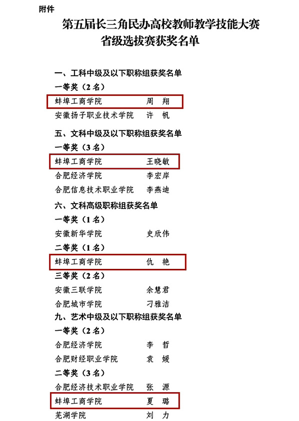 近日,根据省教育厅发布的《安徽省教育厅关于公布第五届长三角民办高校教师教学技能大赛省级选拔赛获奖名单的通知》(皖教秘民〔2025〕25号),我校周翔、王晓敏、仇艳、夏璐四位参赛教师凭借扎实的教学功底和出色的表现,在激烈的省级选拔赛中脱颖而出,充分展现了我校教师队伍的专业素养与育人风采。