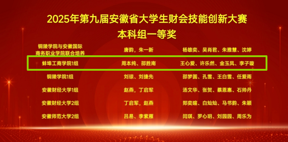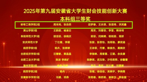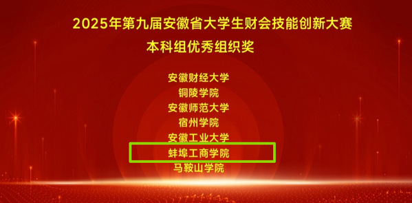 11月15日,由安徽省教育厅主办、铜陵学院承办的2025年安徽省大学生财会技能创新大赛落下帷幕,我校两支代表队分别荣获本科组一等奖和三等奖,学校荣获优秀组织奖!