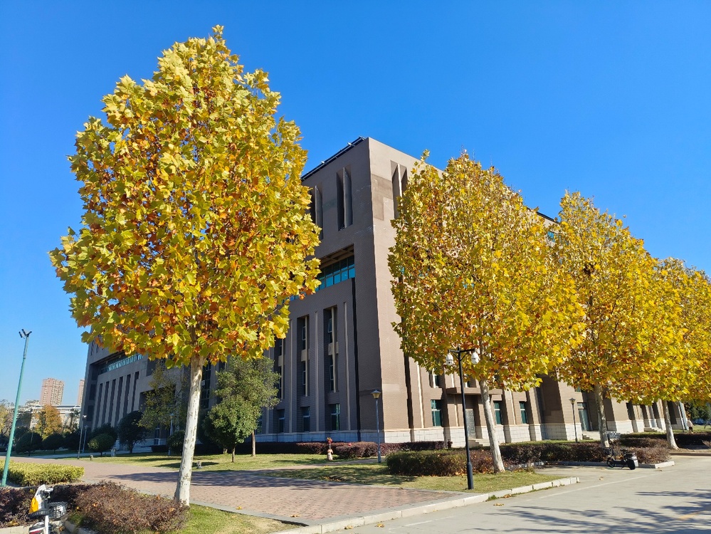 作品拍摄于深秋时节,澄澈蓝天为底,金黄的梧桐叶晕染出浓郁秋意,恰好将现代建筑的硬朗线条柔化。创作时特意以树木为前景,让暖色调枝叶与冷灰建筑形成色彩、质感的对比,既保留了秋日的氛围感,又通过建筑的规整感平衡画面,捕捉校园里季节与人文空间交融的松弛瞬间。