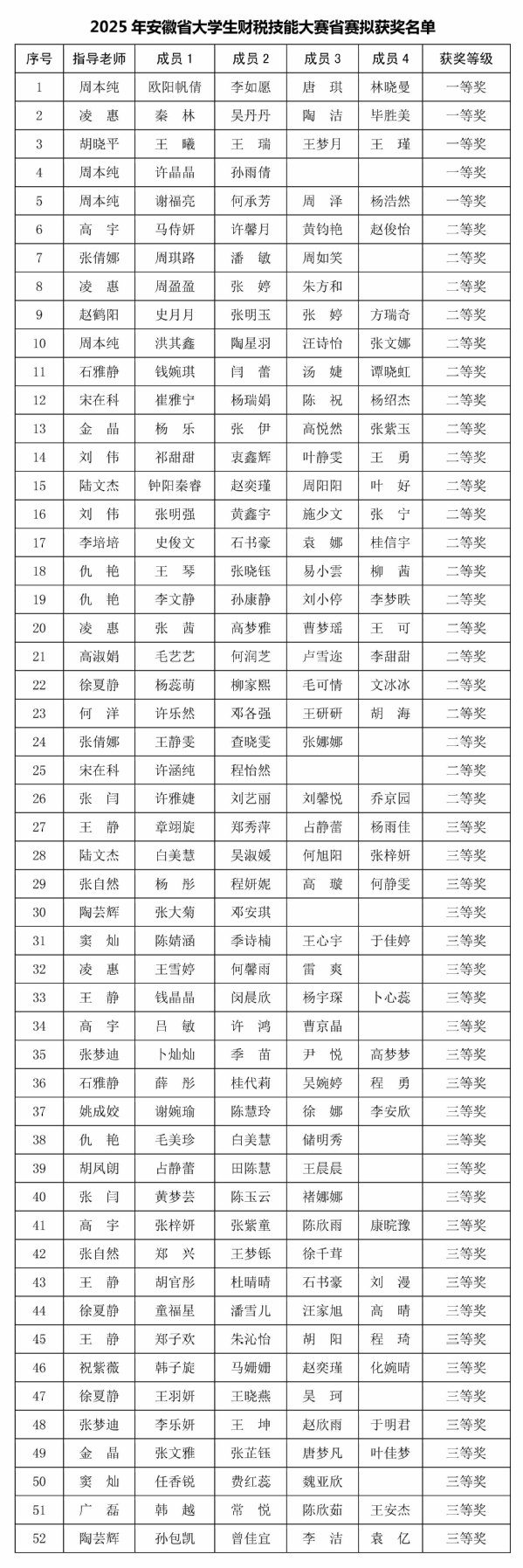 2026年1月5日,由安徽省教育厅主办,安徽财经大学承办的2025年安徽省大学生财税技能大赛成绩公布。我校与全省30余所本科院校近 1300支队伍同台竞技,最终共52支队伍获奖,其中一等奖5项,二等奖21项,三等奖26项,总获奖数位居安徽省第二。