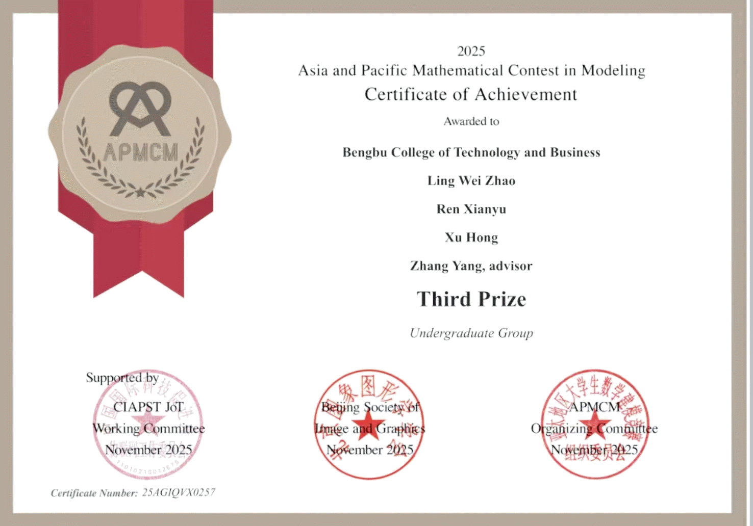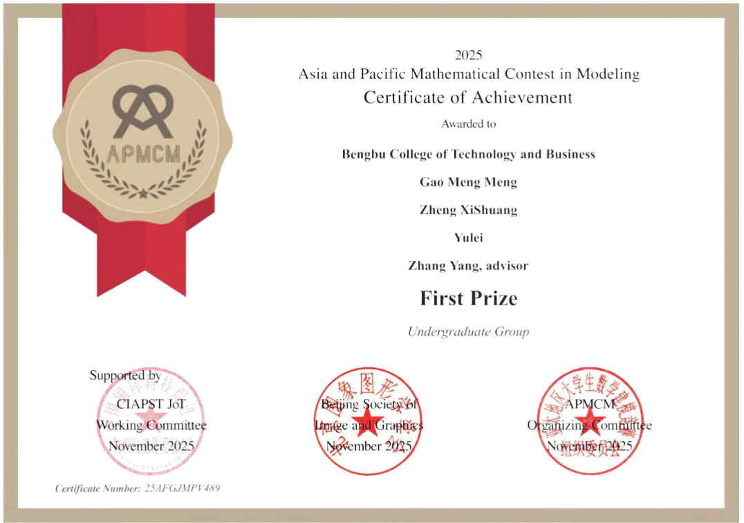 2025年 APMCM 亚太地区大学生数学建模竞赛成绩正式揭晓。在数据科学与应用学院张杨老师的精心指导与团队紧密协作下,由23级市场营销专业郑茜双、23级计算机科学与技术专业余蕾、23级经济统计学专业高梦梦组成的队伍荣获全国一等奖;由23级资产评估专业赵维玲、23级计算机科学与技术专业任献宇、23级审计学专业许鸿组成的队伍荣获全国三等奖。