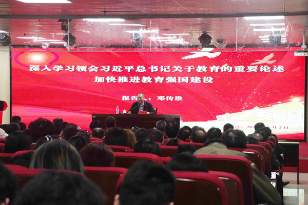 邓传淮以“深入学习领会习近平总书记关于教育的重要论述,加快推进教育强国建设”为主题,紧密结合当前教育现状,重点围绕教育的根本任务、教育的根本问题、全面贯彻党的教育方针、加快建设教育强国、弘扬和践行教育家精神等方面,深入阐释了习近平总书记教育重要论述的丰富内涵和核心要义。同时,他结合自身工作经历,就如何更好地为学、为事、为人和如何做一名忠诚、干净、担当的好干部分享了人生感悟。报告中,邓传淮对我校“忠恕、博学、笃行、致远”的校训给予高度认可,并对学校“六个坚持”等举措给予充分肯定。